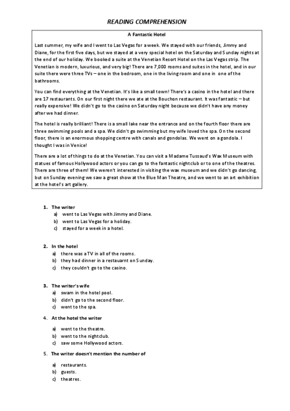 He publicado nuevos ejercicios de Inglés A2: A Fantastic Hotel - reading comprehension.pdf