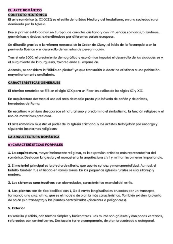 APUNTES Y RESUMEN DEL ARTE ROMÁNICO, 2º BACHILLERATO Contexto histórico, características generales, arquitectura y escultura
