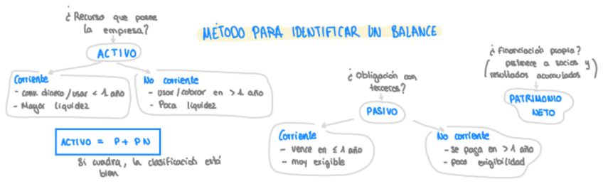 Pequeño esquema o mapa visual que explica un método para identificar los elementos de un balance contable. Además, agregué pequeñas notas alrededor explicando cada concepto.