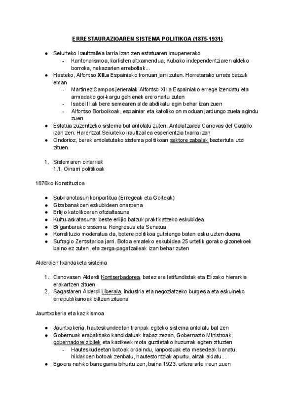 ERRESTAURAZIOAREN SISTEMA POLITIKOA (1875-1931)