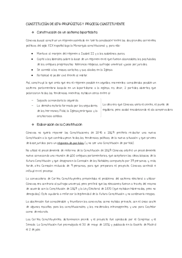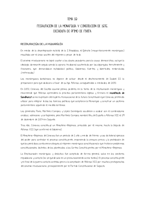 Resumen de la LECCIÓN 18: Restauración de la Monarquía y Constitución de 1876. Dictadura de Primo de Rivera. (Cap V CHE)
