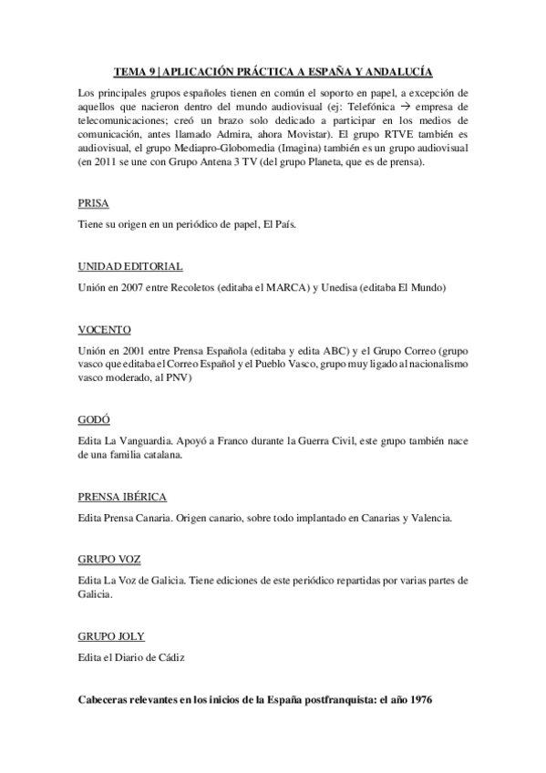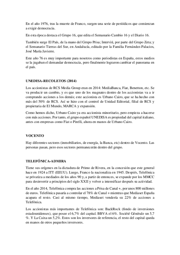 Grupos más importantes: Vocento, Prisa, Planeta y Telefónica. No dejar de prestar atención a los canales regionales.
