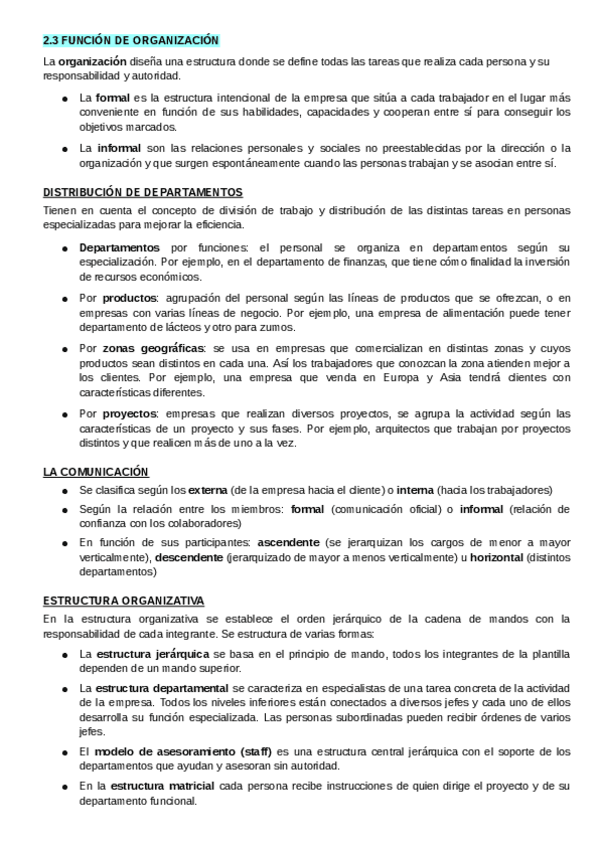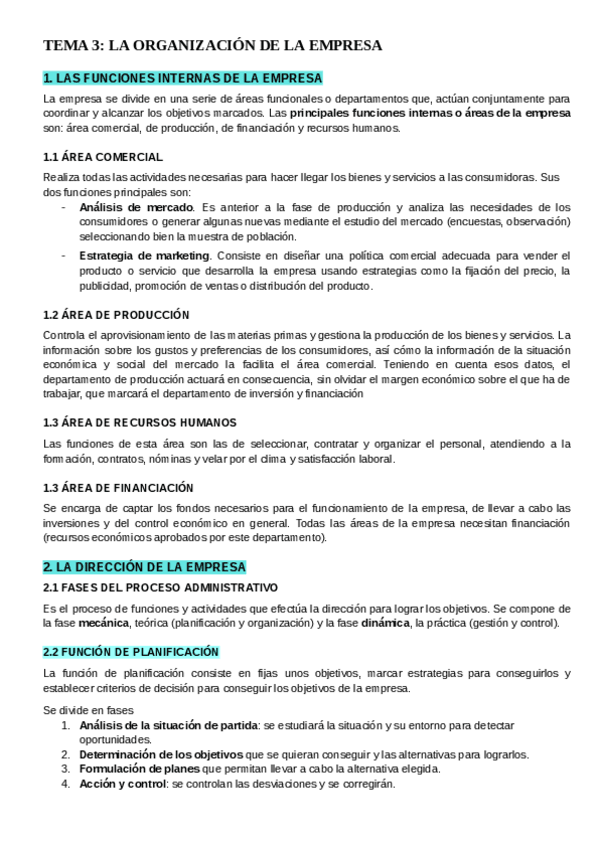 1. Funciones internas de la empresa - área comercial - área de producción - área de recursos humanos - área de financiación 2. Dirección de la empresa - Función de planificación - Función de organización - distribución d