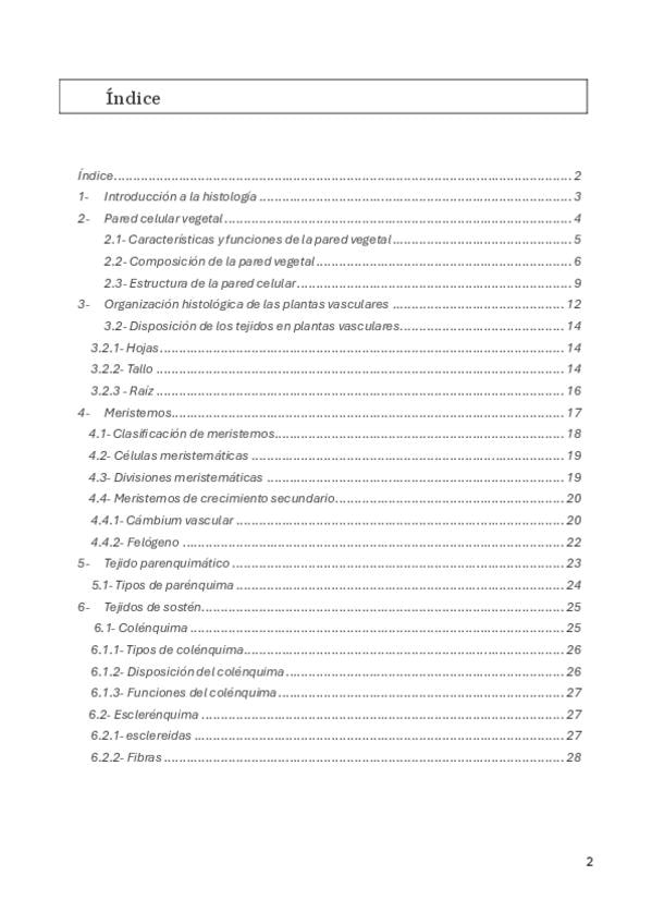 Histología desde el tema 1 (Introducción) al 6 (tejidos de sostén). 1- Introducción a la histología 2- Pared celular vegetal 3- Organización histológica de las plantas vasculares 4-Meristemos 5- Parénquima 6- Tejidos de sotén