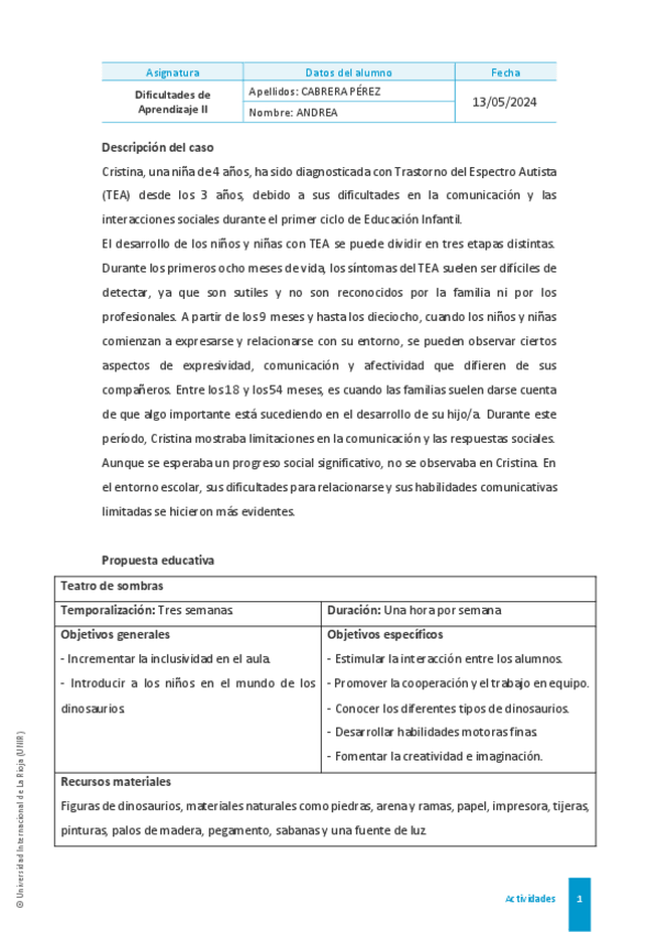He publicado nuevos practicas de 1º Dificultades de Aprendizaje I: CABRERAPEREZANDREACasopracticoTEA.pdf