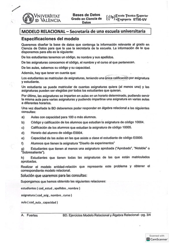 Ejercicio secretaria de una universidad. Modelo E/R, Modelo Relacional y Algebra Relacional