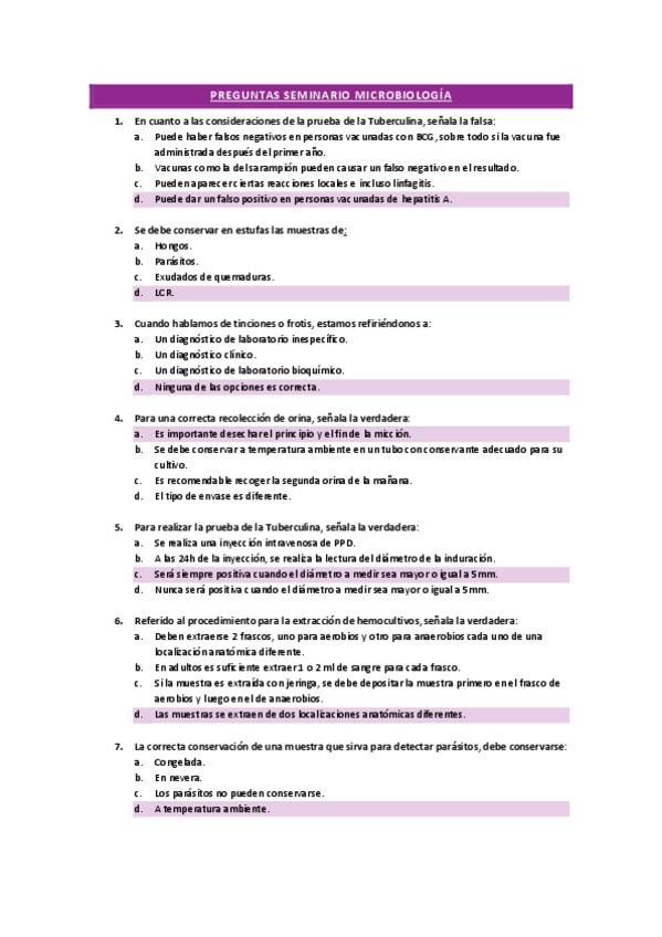 Preguntas tipo test del seminario de Microbiología: Recogida de muestras bioquímicas