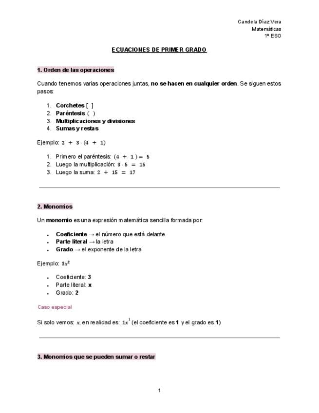 Ecuaciones de primer grado (1º ESO). Apuntes con ejemplos.
