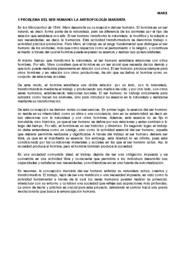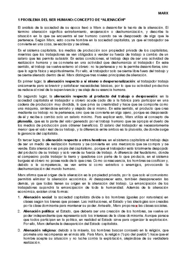 desarrollo de los problemas que aborda marx (antropología o problema del ser humano y sus alineaciones, problema de la sociedad y materialismo histórico y lucha de clases, concepción del conocimiento, la ética y crítica de Dios).
