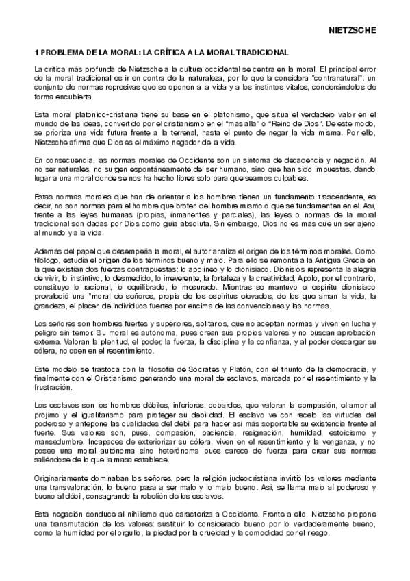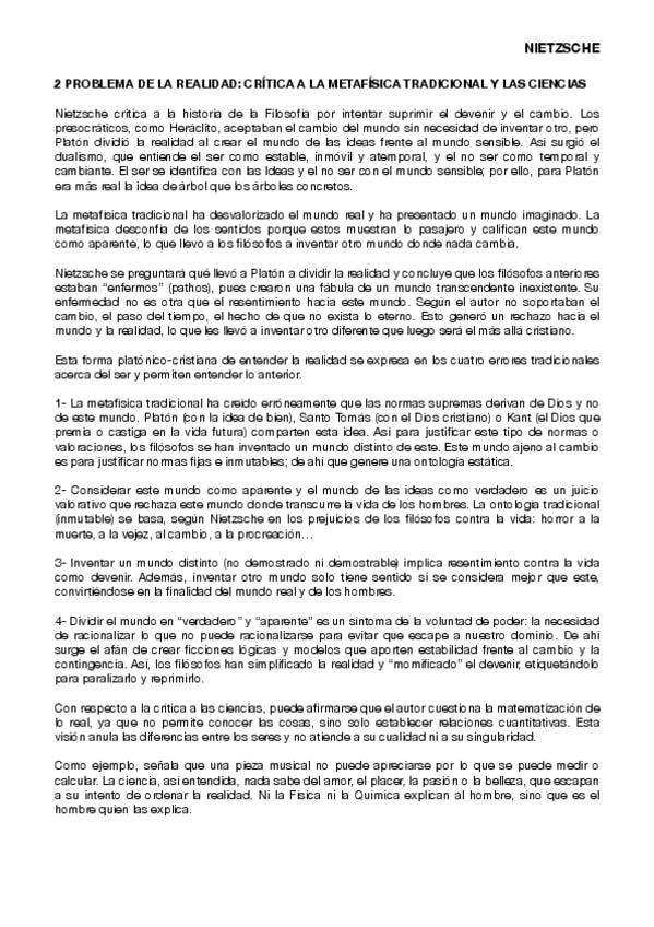 desarrollo de los problemas que enfrenta Nietzsche. Problema de la moral: crítica a la moral tradicional. Problema de la realidad: crítica a la metafísica tradicional y las ciencias. Problema de Dios: el nihilismo. Problema del conocimiento: el perspectiv