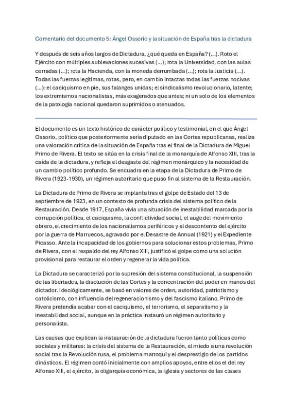 Comentario de texto sobre un documento perteneciente a la etapa de la dictadura de Primo de Rivera. Preparación PAU 2026. 2º Bachillerato