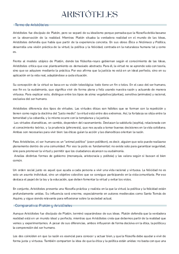 Apuntes con ejemplo de tema de Aristóteles y comparativa de Aristóteles y Platón