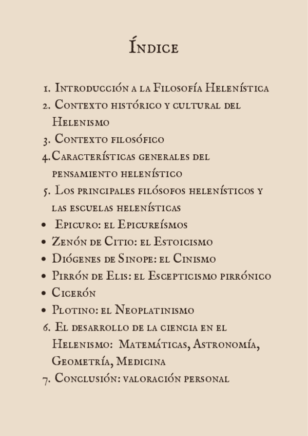 Trabajo sobre la Filosofía Helenista, con un 10 de nota!!! Tiene: índice, introducción, contexto histórico, cultural y filosófico, características generales del pensamiento, principales filósofos (profundizando sobre cada uno) y valoración personal.