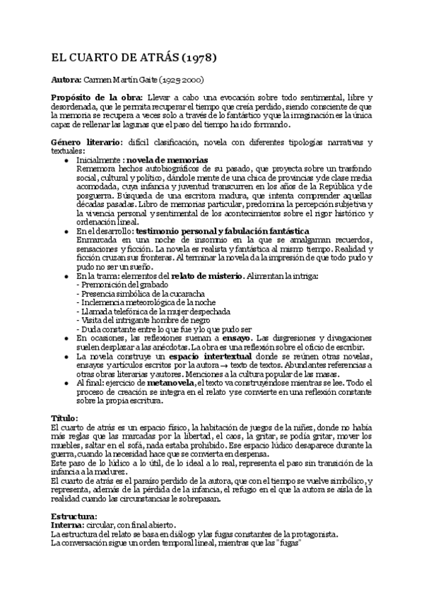 Apuntes completos resumidos de la obra "El cuarto de atrás" de Carmen Martín Gaite, lectura obligatoria para la PAU de Andalucía