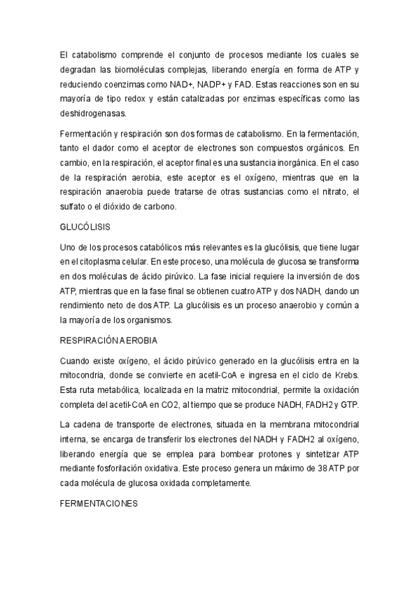 Resumen del metabolismo celular para 2º de Bachillerato, con explicación clara y ordenada de procesos catabólicos y anabólicos.