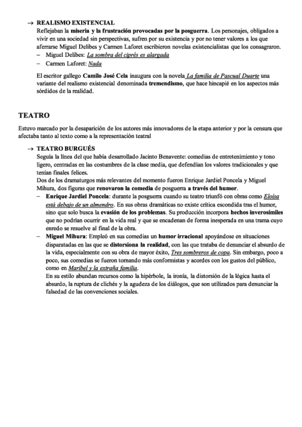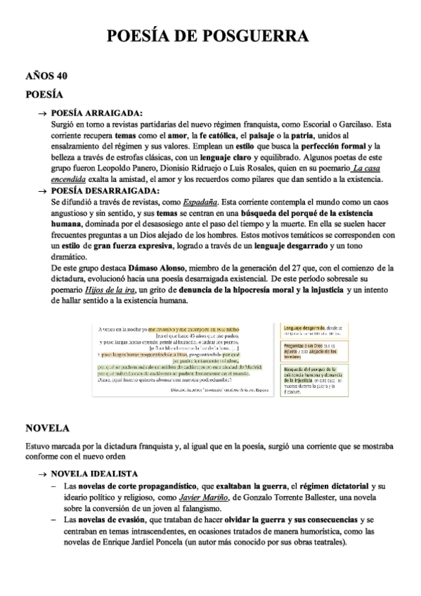 Apuntes con toda la información y características sobre la literatura de posguerra de los años 40, 50 y 60