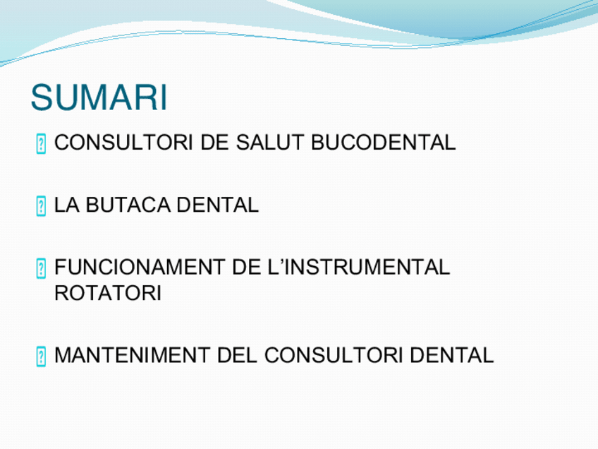 Característiques clinca i tipus Espais i àrees de treball (informació de totes les àrees) Butaca dental i les seues parts i informació de cada part Moviments de la butaca i material rotatori Manteniment del consultori dental Documentació clínica i no clí