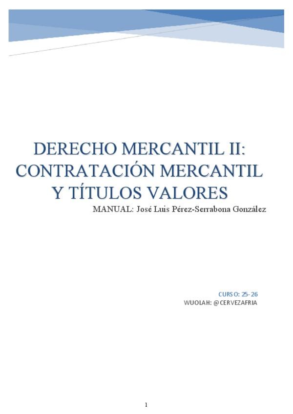 1º parte. Temario del manual Derecho Mercantil II: contratación mercantil y títulos valores.