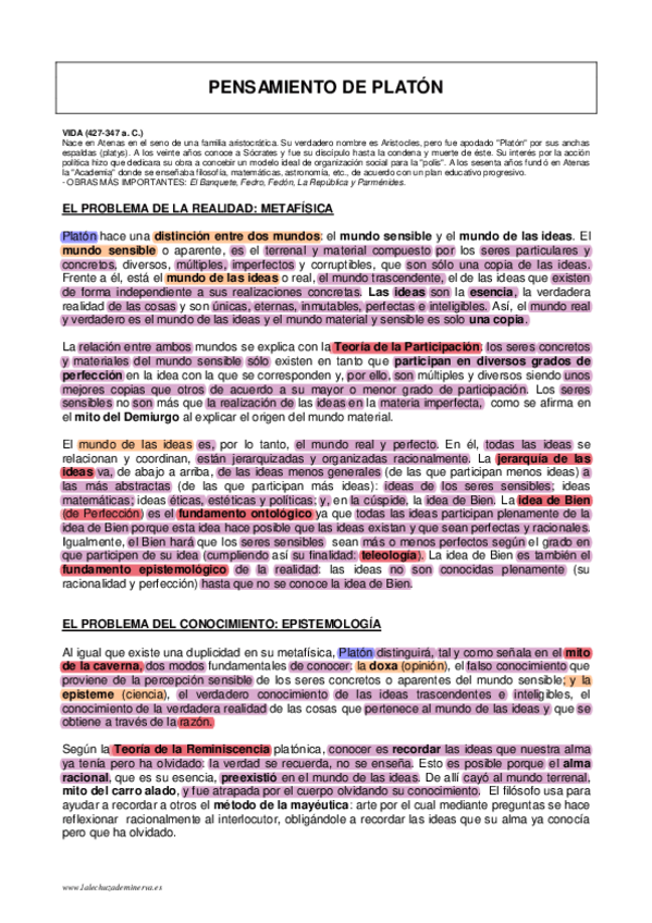 Conceptos básicos del pensamiento de Platón subrayados y con las palabras clave destacadas.