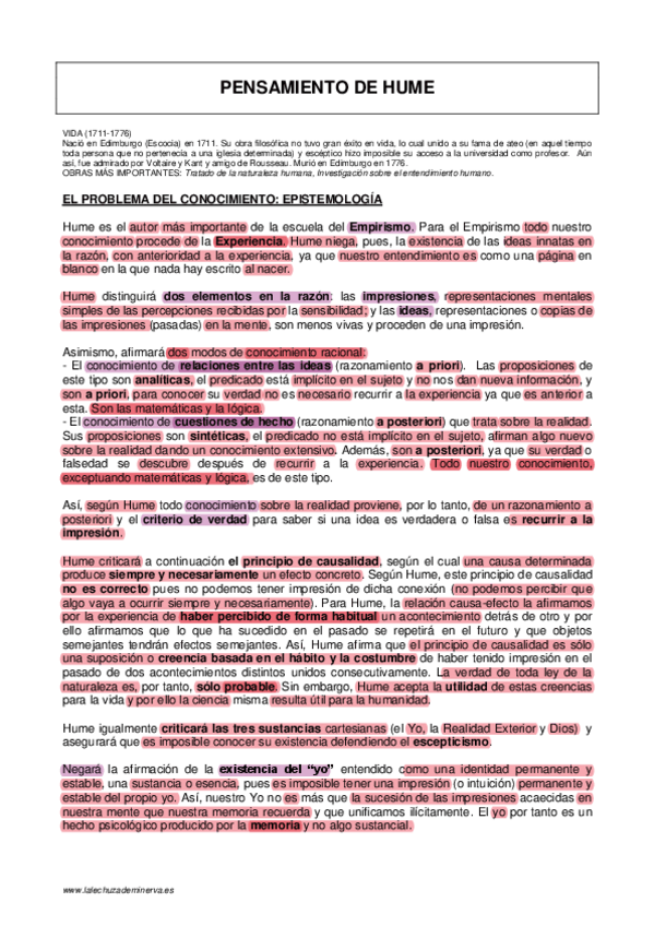 Conceptos básicos del pensamiento de Hume subrayados y con las palabras clave destacadas