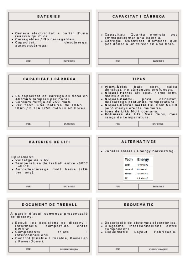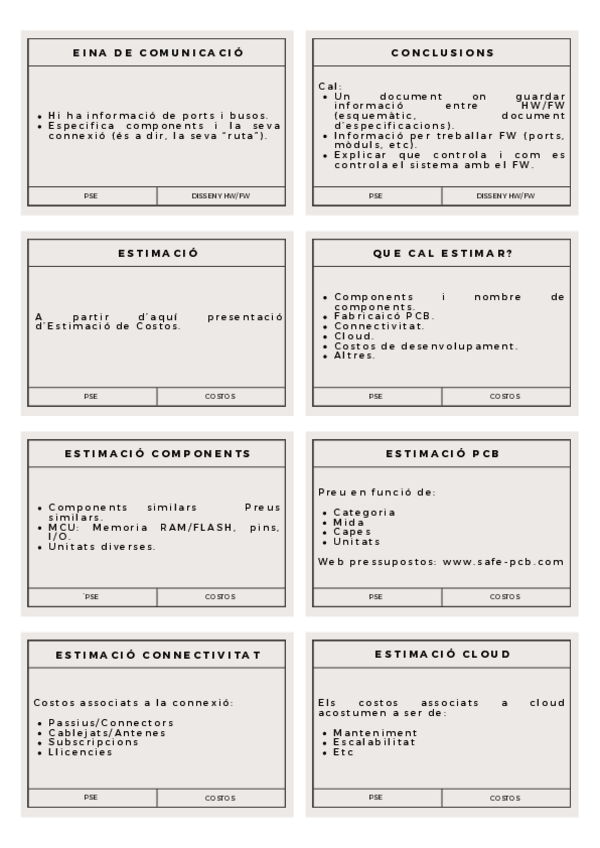 Tarjetes per imprimir de les presentacions de Fonts d'Energia, Disseny HW/FW i Estimació de Costos
