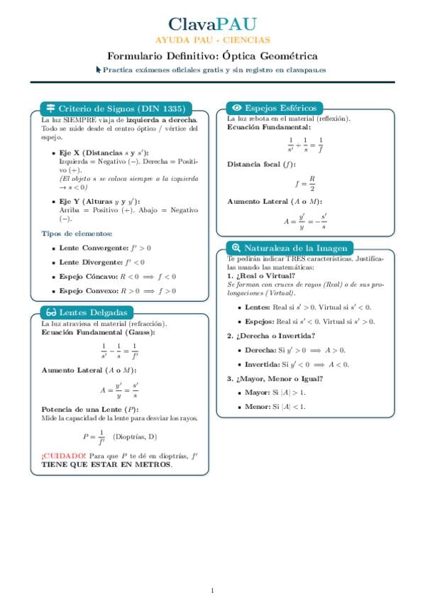 Formulario completo del bloque de Óptica Geométrica para la PAU de la Comunidad de Madrid.