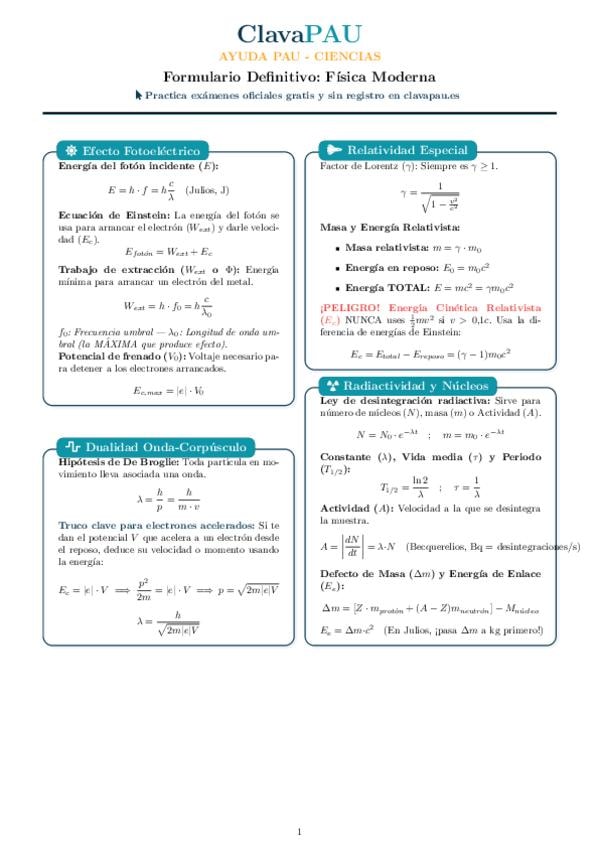 Formulario completo del bloque de Física Moderna para la PAU de la Comunidad de Madrid.