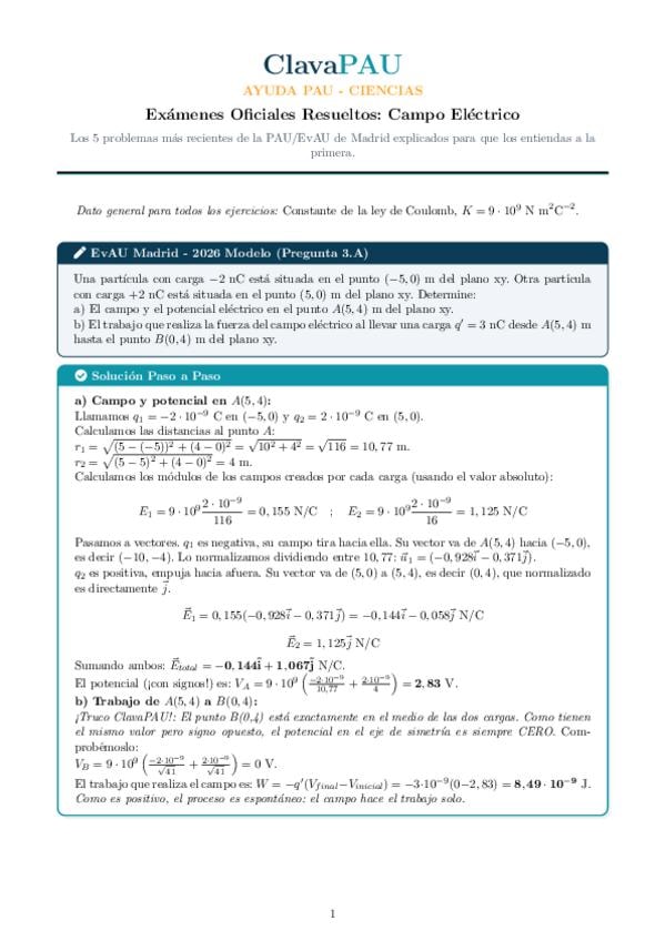 Formulario completo del bloque de Campo Eléctrico para la PAU de la Comunidad de Madrid.
