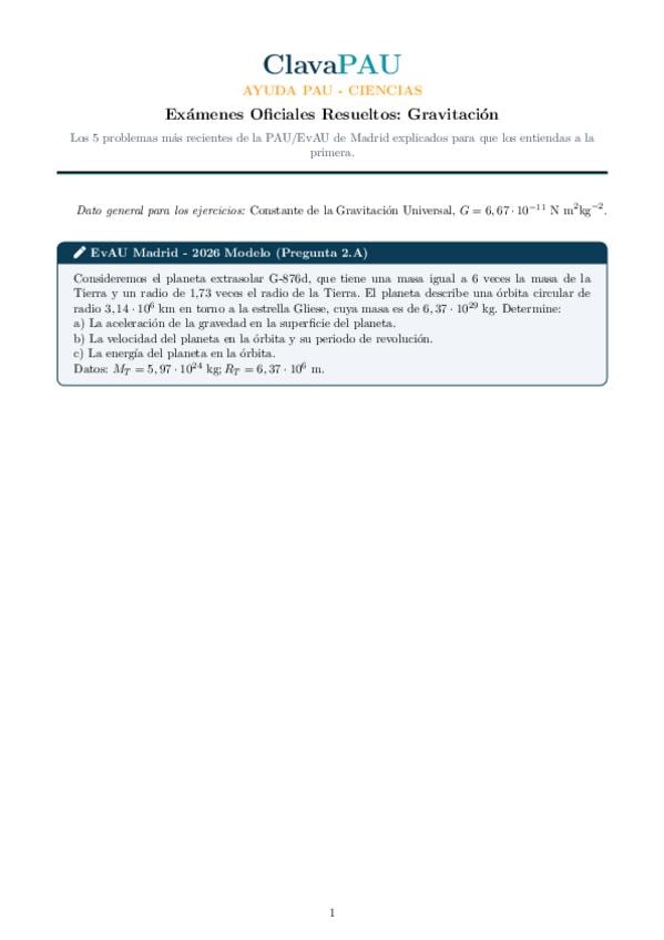 Formulario completo del bloque de Campo Gravitatorio para la PAU de la Comunidad de Madrid.
