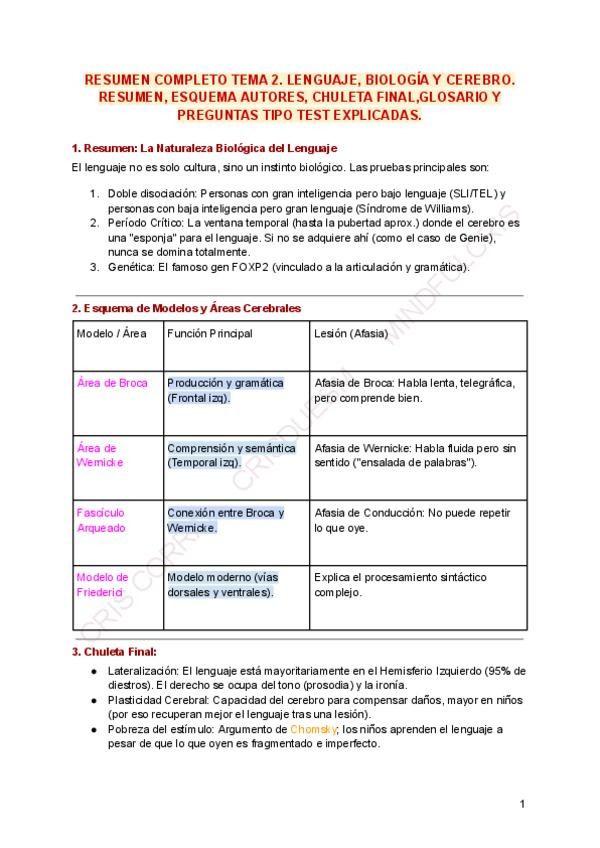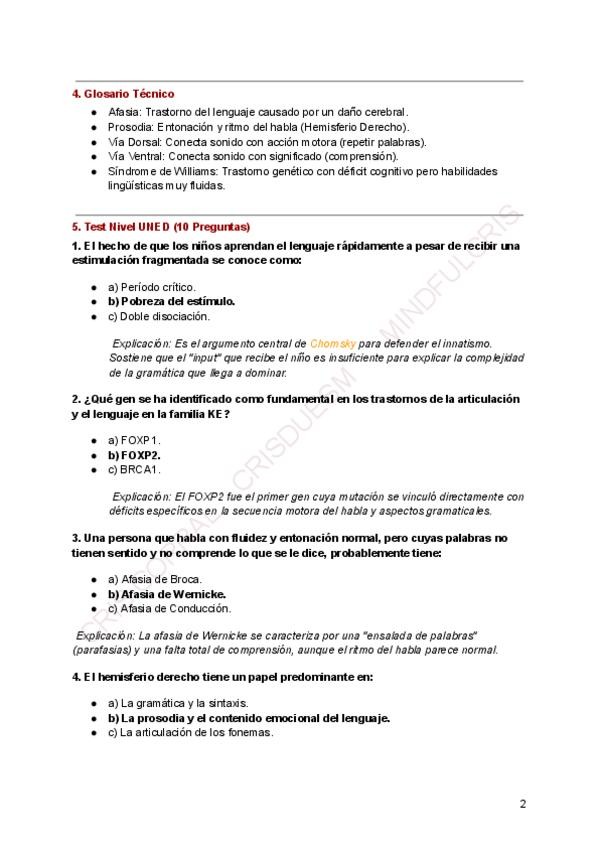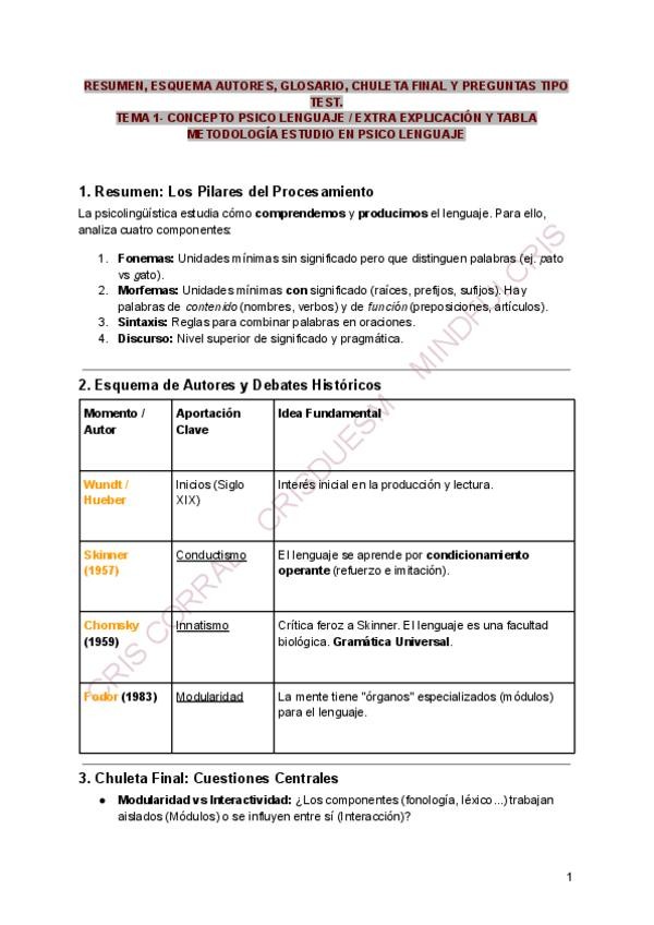 Resumen, esquema autores, chuleta final, glosario y 10 preguntas tipo test explicadas. Extra: metodología de estudio en psico del lenguaje