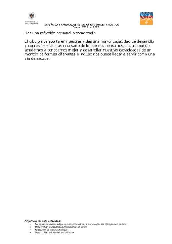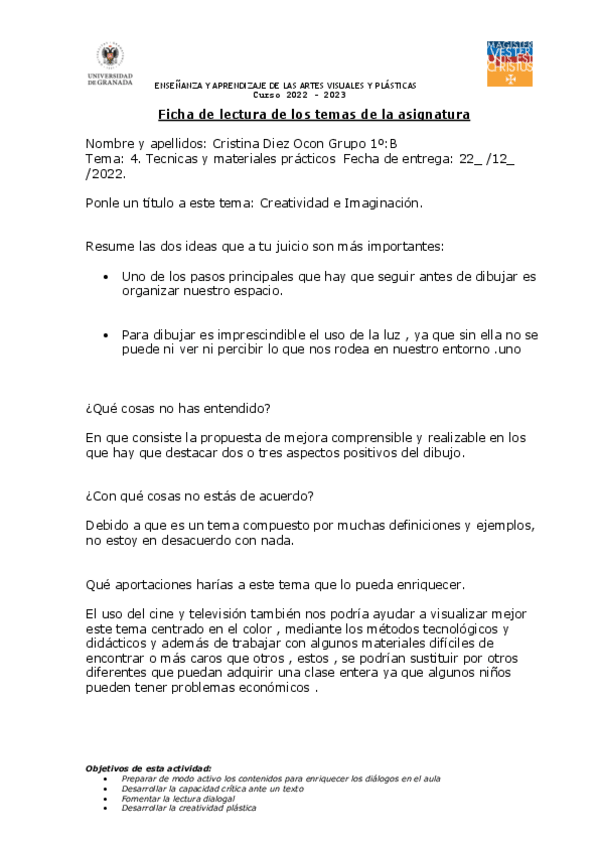 He publicado nuevos practicas de 1º enseñanza y Aprendizaje de las Artes Visuales y Plásticas: FICHA-LECTURA-T1.pdf