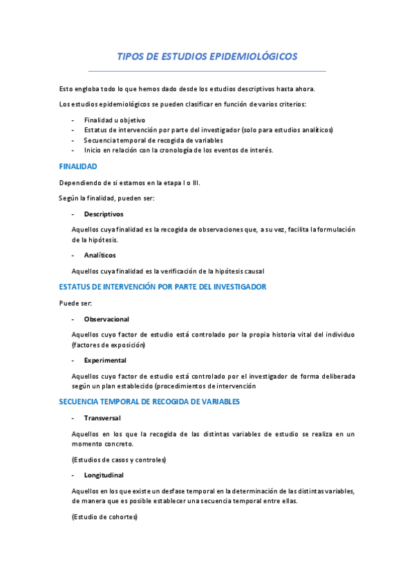 Resumen aclaratorio de estudios epidemiológicos. Muy bueno para aclarar conceptos para el tipo test