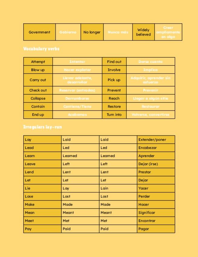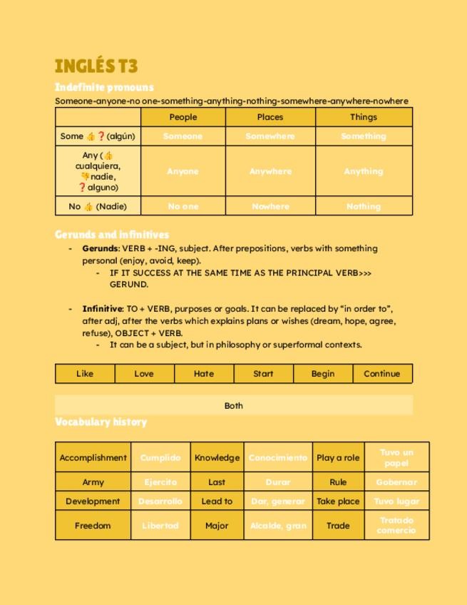 Resumen de la unidad tres de inglés, contiene: Indefinite pronouns, gerunds and infinitives, vocabulario de la historia y irregulares del Lay- Run + extra