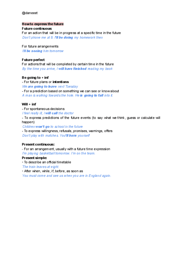 Future perfect, future continuous, Be going to, Present continuous, Present simple