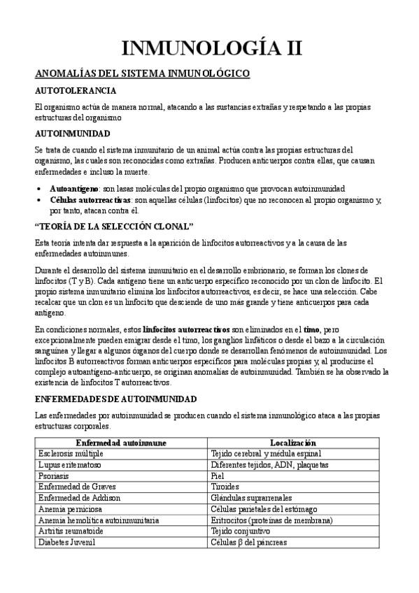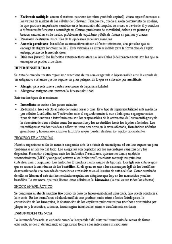 Resumen de Anomalías del Sistema Inmunológico ideal para 2º Bachillerato y PAU. Lleva espacios para los dibujos.