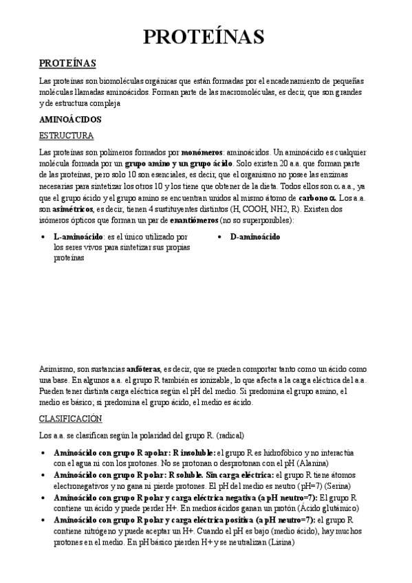 Resumen de Proteínas y Enzimas ideal para 2º Bachillerato y PAU. Lleva espacios para los dibujos.