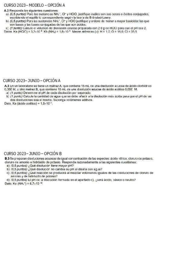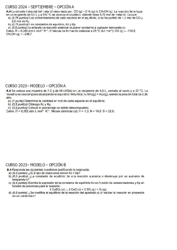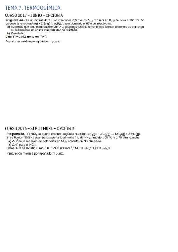 Ejercicios PAU Química bloque termoquímica, equilibrio, ácido-base, redox