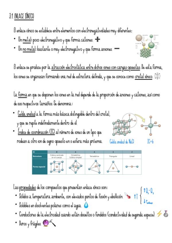 Resumen 100% completo del tema de enlace químico. Repasaremos los tres tipos de enlace (iónico, covalente y metálico), así como sus propiedades. También veremos: - Ciclo de Born-Haber - Lewis: octeto y casos especiales - TRPECV - TEV + hibridación - Geome
