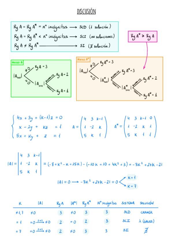 Discusión y resolución de un sistema de 3 ecuaciones con un parámetro. 100% explicado y completo.