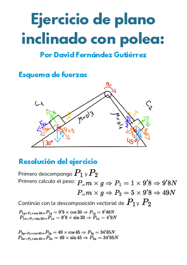 Se explica la resolución de un ejercicio de un doble plano inclinado con polea. Consta de un esquema de fuerzas y la resolución del ejercicio