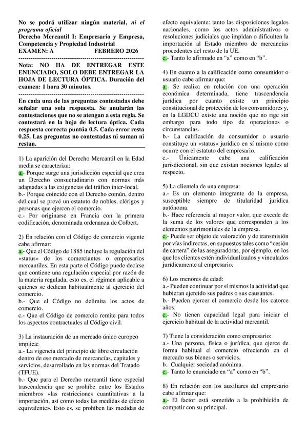 EXAMENES RESUELTOS AÑO 2018-2019 DERECHO MERCANTIL I: EMPRESARIO Y EMPRESA, COMPETENCIA Y PROPIEDAD INDUSTRIAL