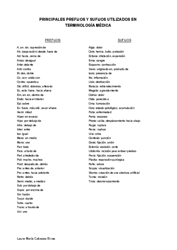 Principales prefijos, sufijos y raíces utilizadas en jerga médica.
