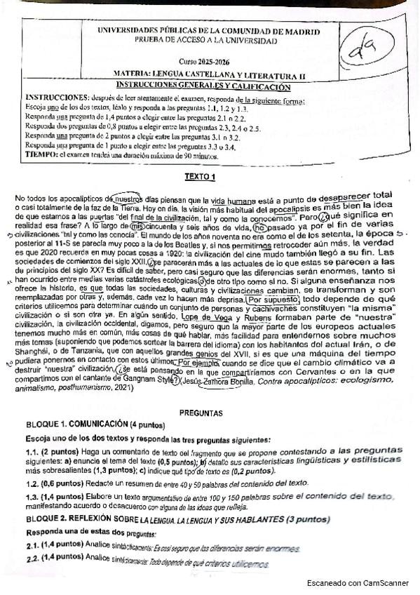 EXÁMENES LENGUA CASTELLANA Y LITERATURA II 2º BACH CCSS 25-26