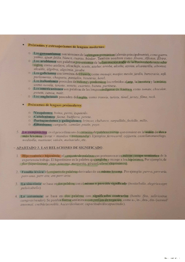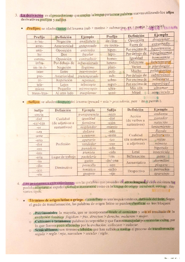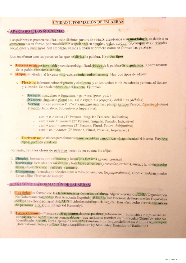 Apuntes de la Formación de palabras todo subrayado y dividido por colores