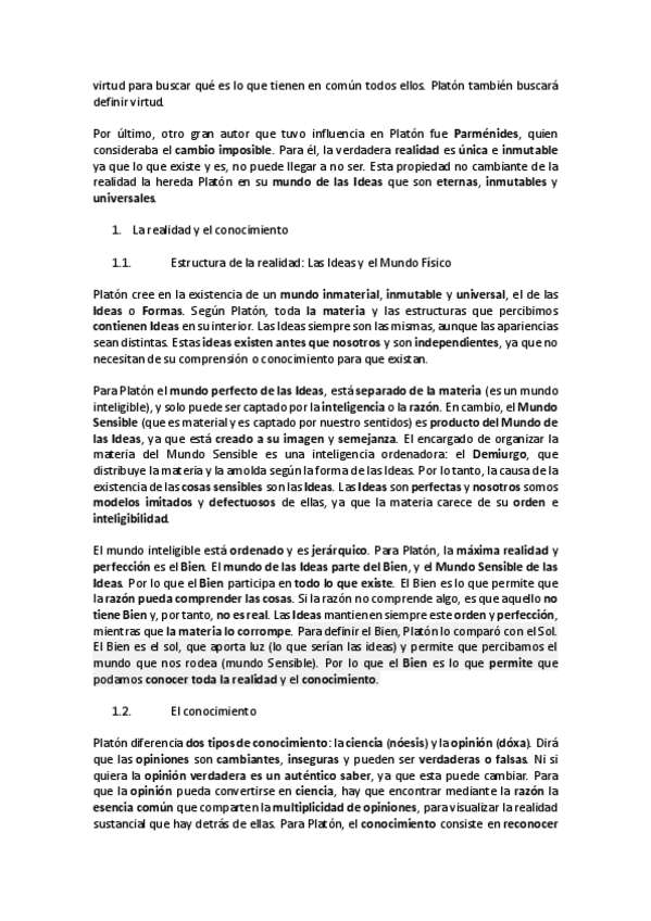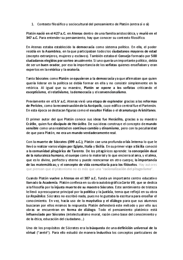 Apuntes PLATÓN COMPLETO (6 pág.) Contexto Filosófico-Sociocultural, doctrinas, y modelo de comentario de texto para PEVAU.