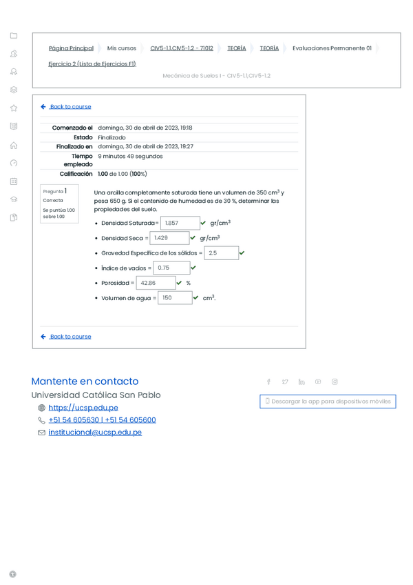 Una arcilla completamente saturada tiene un volumen de 350 cm3 y pesa 650 g. Si el contenido de humedad es de 30 %, determinar las propiedades del suelo.