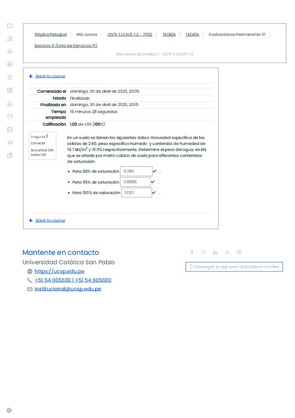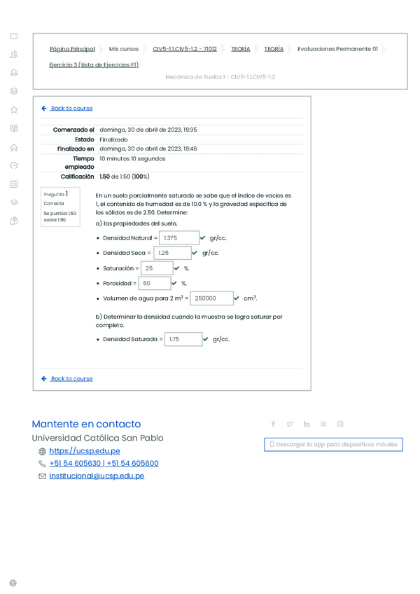 En un suelo parcialmente saturado se sabe que el índice de vacíos es 1, el contenido de humedad es de 10.0% y la gravedad específica de los sólido es de 2.50. Determine: