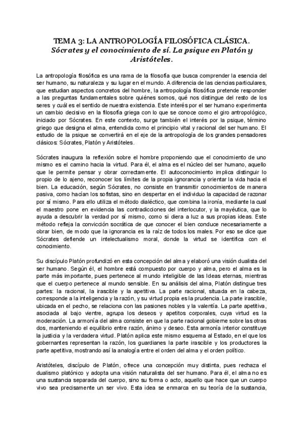 Redacción sobre la antropología filosófica de Platón, Sócrates y Aristóteles. En castellano