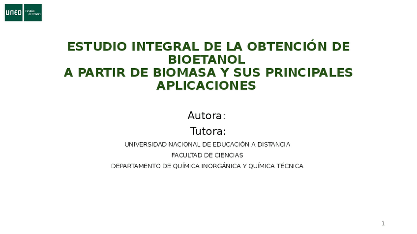 PRESENTACIÓN TRABAJO FIN DE GRADO : ESTUDIO INTEGRAL DE LA OBTENCIÓN DE BIOETANOL A PARTIR DE BIOMASA