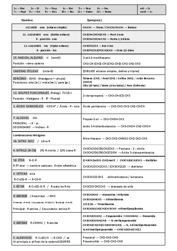 Tabla de nombres, estructura y ejemplos. Formulación Orgánica (Ejercicio 1 Selectividad)